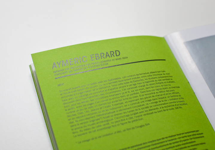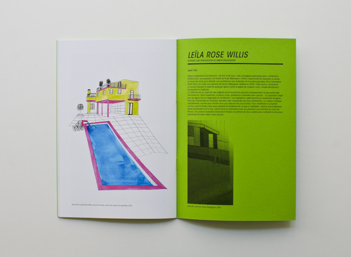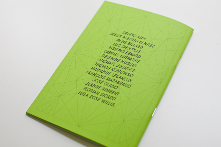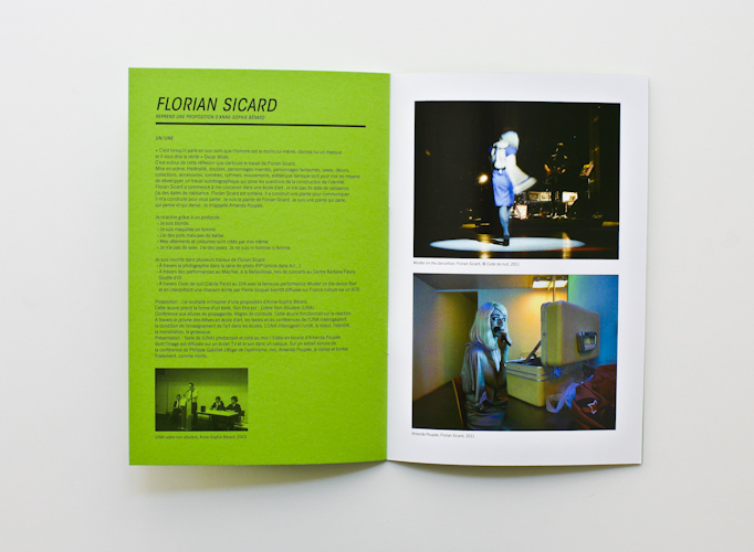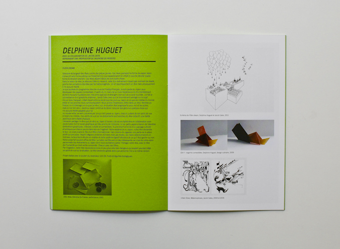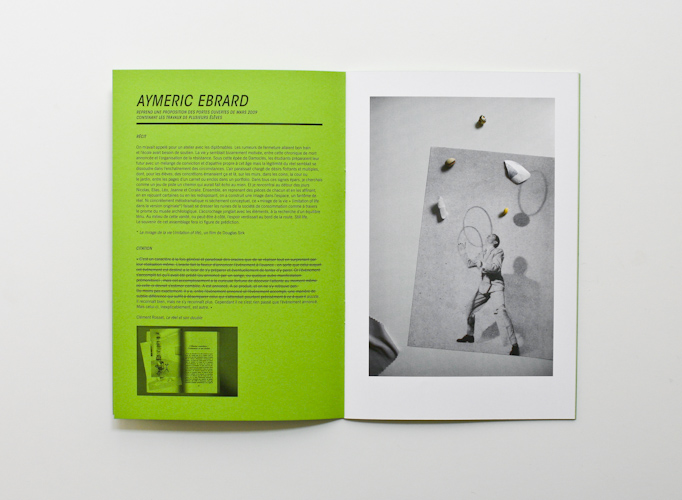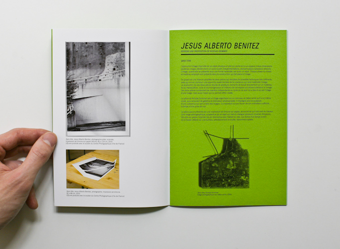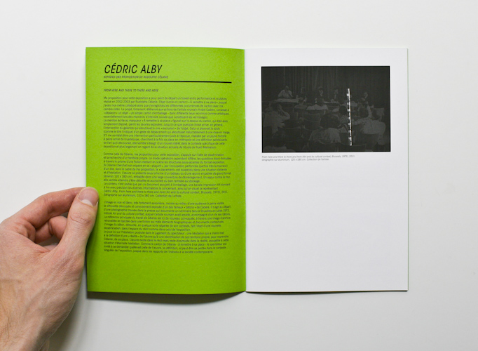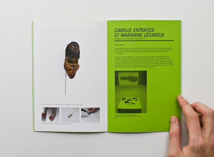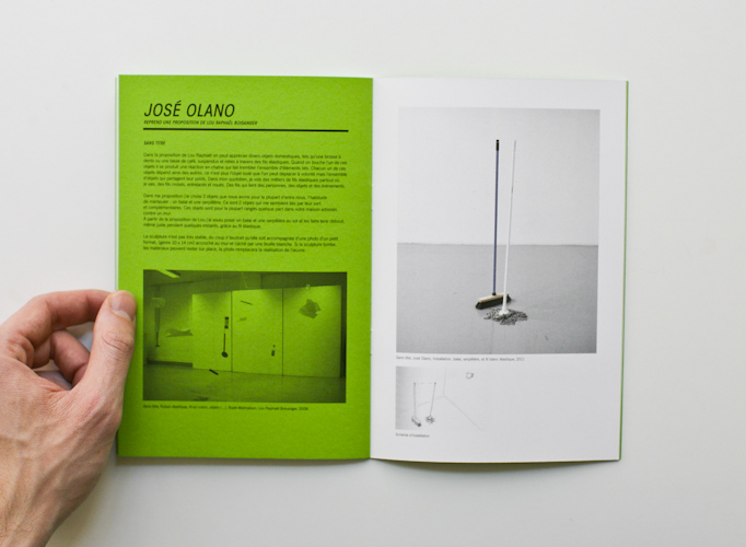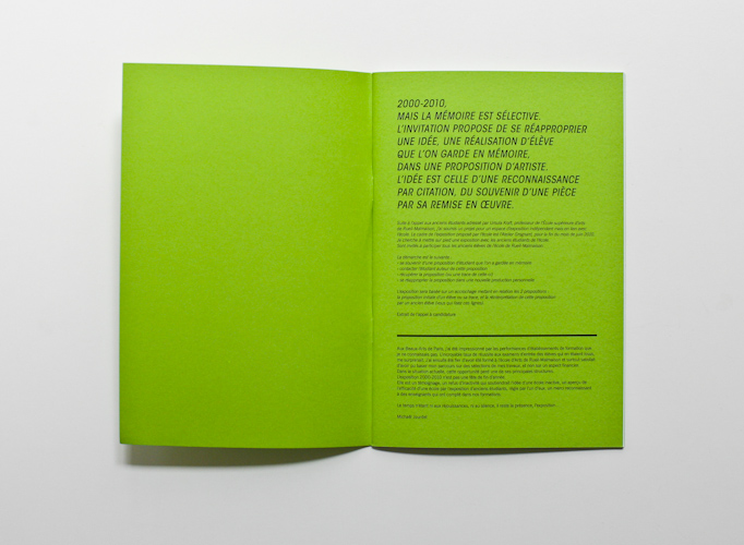 This catalogue orchestrates the exhibition's principle: each green page shows on the one hand some images of the very artwork each artist will recreate, on the other a text explaining his intention. In front of this, on the shinning white paper, additional images allow the viewer to imagine what will be the future creation.