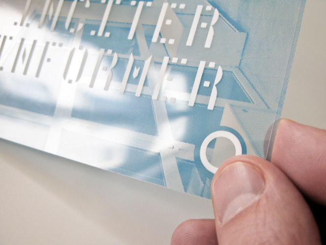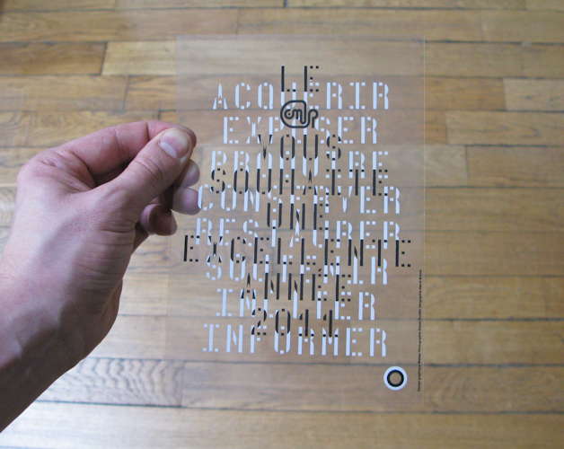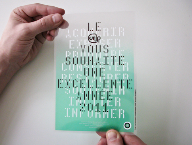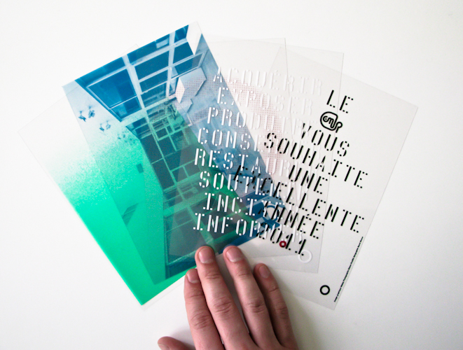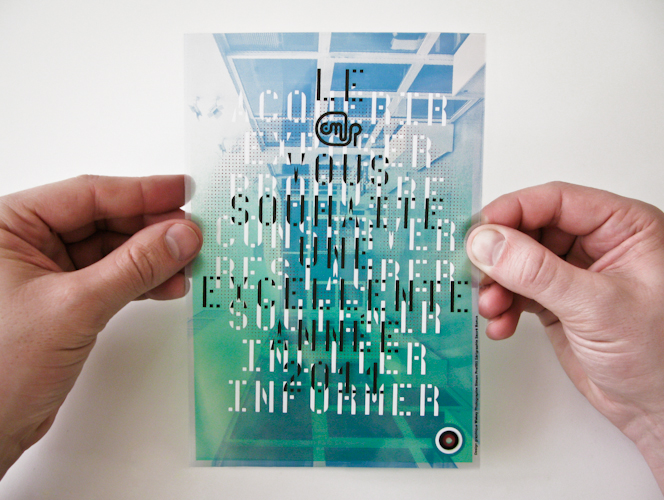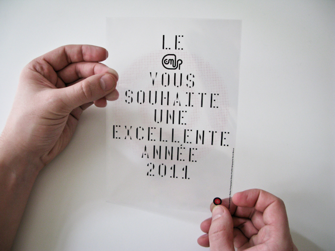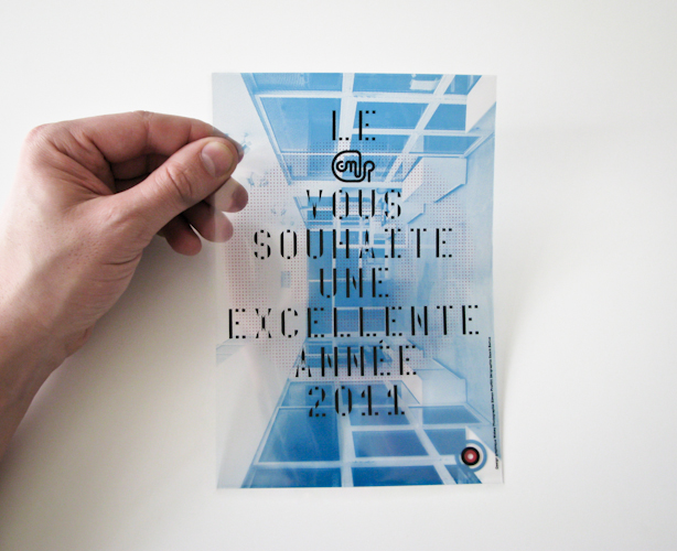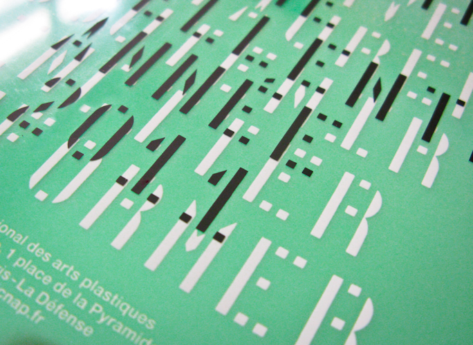 Conception de la carte de voeux 2011 du CNAP (Centre National des Arts Plastiques). Les missions du CNAP sont plurielles. Il s'adresse à la fois aux artistes, aux conservateurs, aux collectionneurs, au grand public, etc. C'est à partir de cette idée que nous avons conçu une carte composée de 5 feuilles de papiers transparentes sérigraphiées que chacun peut assembler dans l'ordre qu'il veut, selon le regard qu'il porte sur le CNAP. Chaque feuille comporte un élément graphique différent (typographie, dégradé, image, trame). Pour ce projet, nous avons utilisé notre typographie Stane, basée sur une grille verticale favorisant les jeux typographiques et optiques.