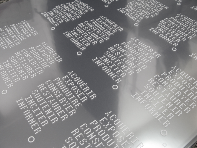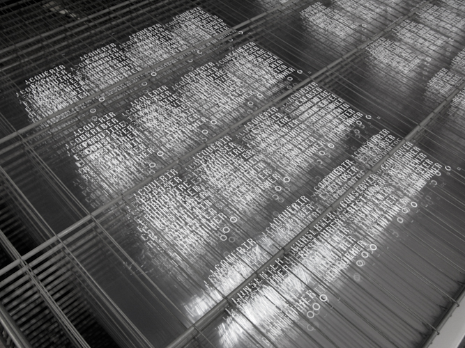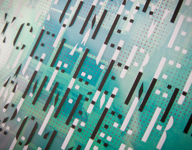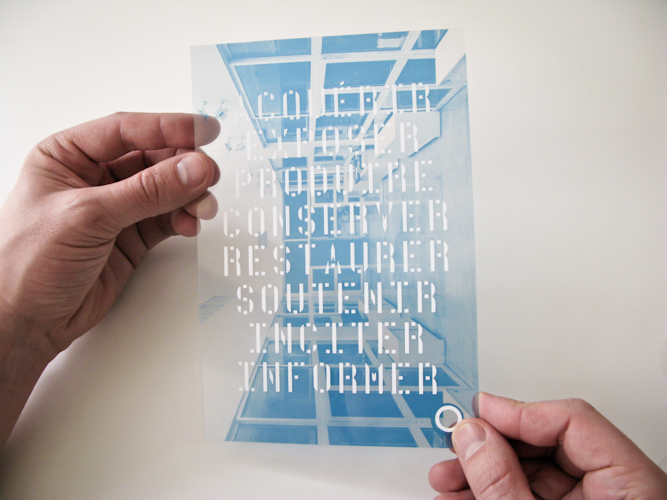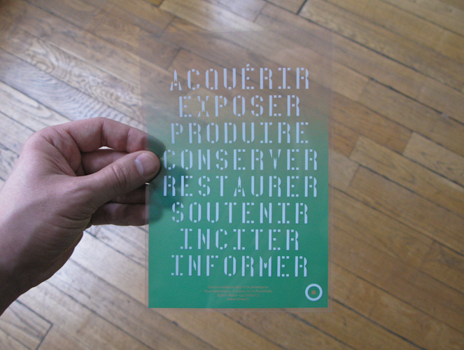 /Conception of the greeting card 2011 of the CNAP (Centre National des Arts Plastiques). The aims of the CNAP are plurials: it concerns the artists, but also the curators, the collectors, the general public, etc. Our work is based on this idea. The card arranges 5 sheets of transparent paper, silkscreened. These sheets can be organized in different orders, depending on how one sees the CNAP. Each sheet is composed of different graphic elements (type, shaded off, pattern, image). In this project we have used the Stane: a type we have made on the idea of a vertical grid, which enhances both typographical and optical illusions.