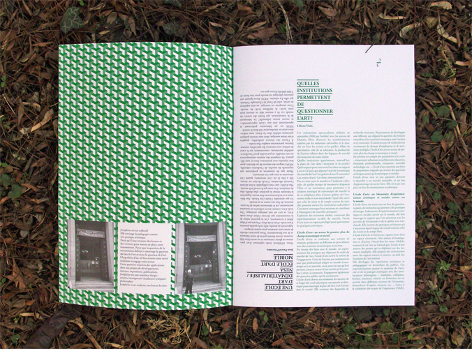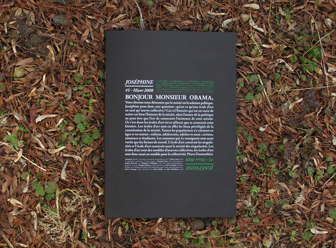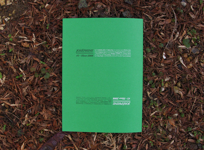 Josefffine est une revue qui aborde la question de l’enseignement de l’art contemporain. Le contenu de ce numéro est divisé en deux parties placées tête-bêche.