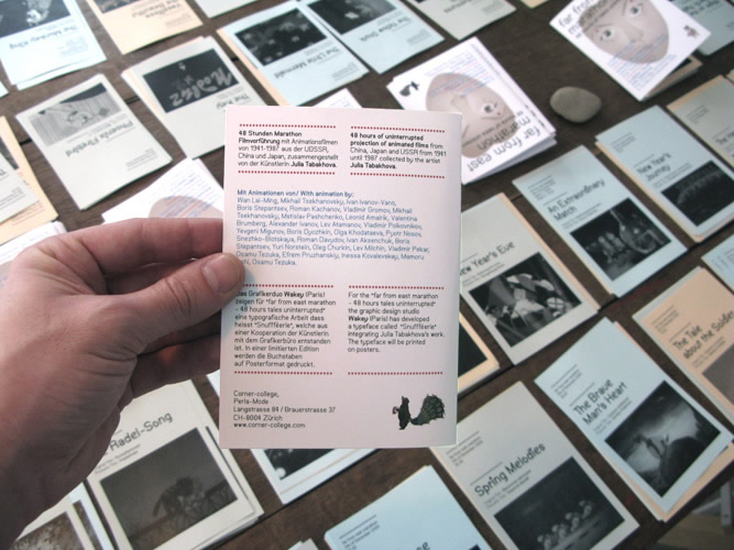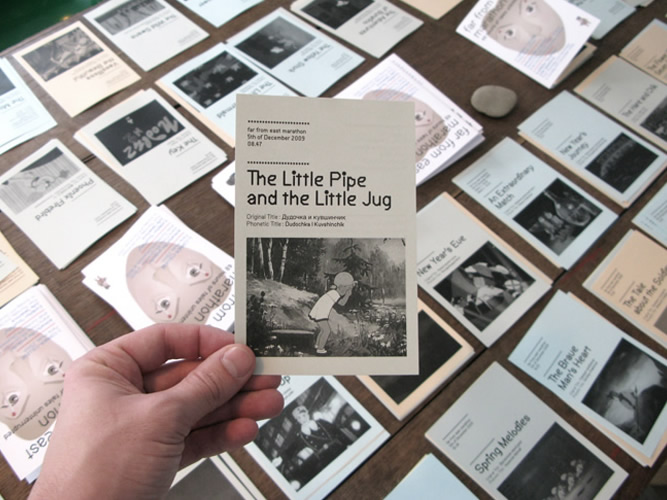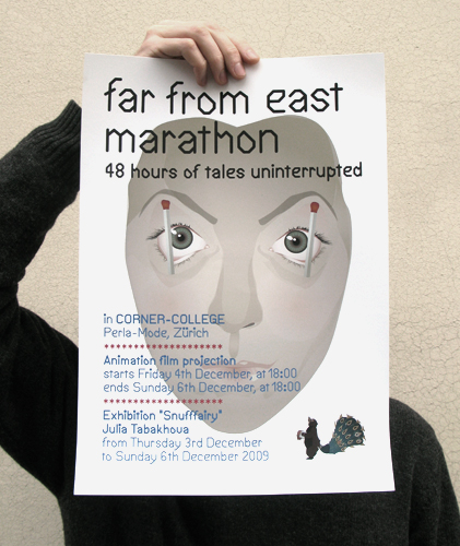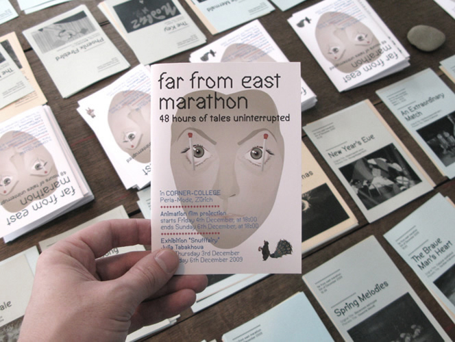 Far from east marathon est un évènement qui a eu lieu au Corner College à Zürich en décembre 2009. Cet évènement a présenté des pièces de l'artiste Julia Tabakhova, en parrallèle d'une projection marathon proposant 48 heures ininterrompues de films d'animation russes, japonais et chinois. A cette occasion étaient également exposé la Snuffféérie, un alphabet que nous avons développé à partir du travail de Julia Tabakhova. Nous avons pris en charge la conception graphique de la communication de l'évènement: création de l'affiche, du programme et d'une fiche pour chaque film projeté. Tous ces documents sont composés en Balaclava et en Balaclava alt, deux fontes que nous avons dessinées en 2009.