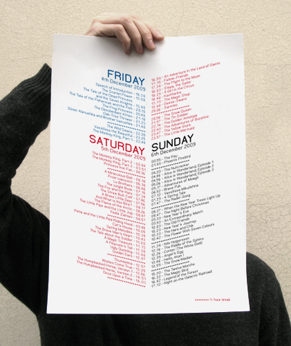 Far from east marathon is an event which took place at the Corner College gallery in Zürich in December 2009. This event presented some works from the artist Julia Tabakhova, and an uninterrupted projection of russian, japanese and chinese animation films. We have shown as well the Snuffairy, a typeface integrating Julia Tabakhova's illustrations and pictograms. We took care of the graphic design of this exhibition: creation of the poster, of the program and of files for all the films presented. All these documents are composed with the Balaclava and the Balaclava alt, 2 typefaces we designed in 2009.